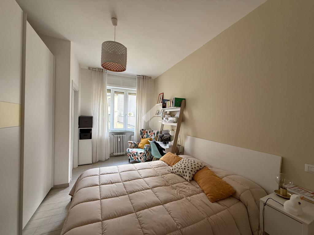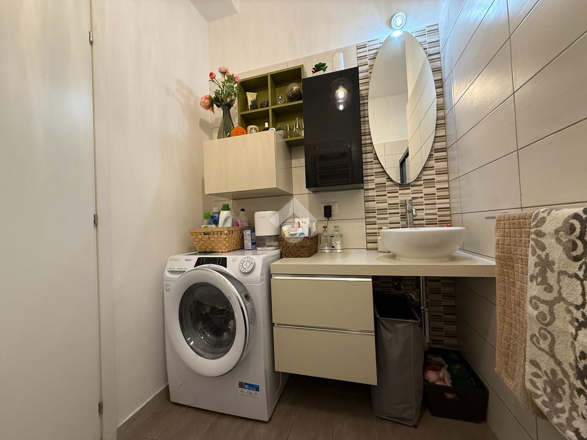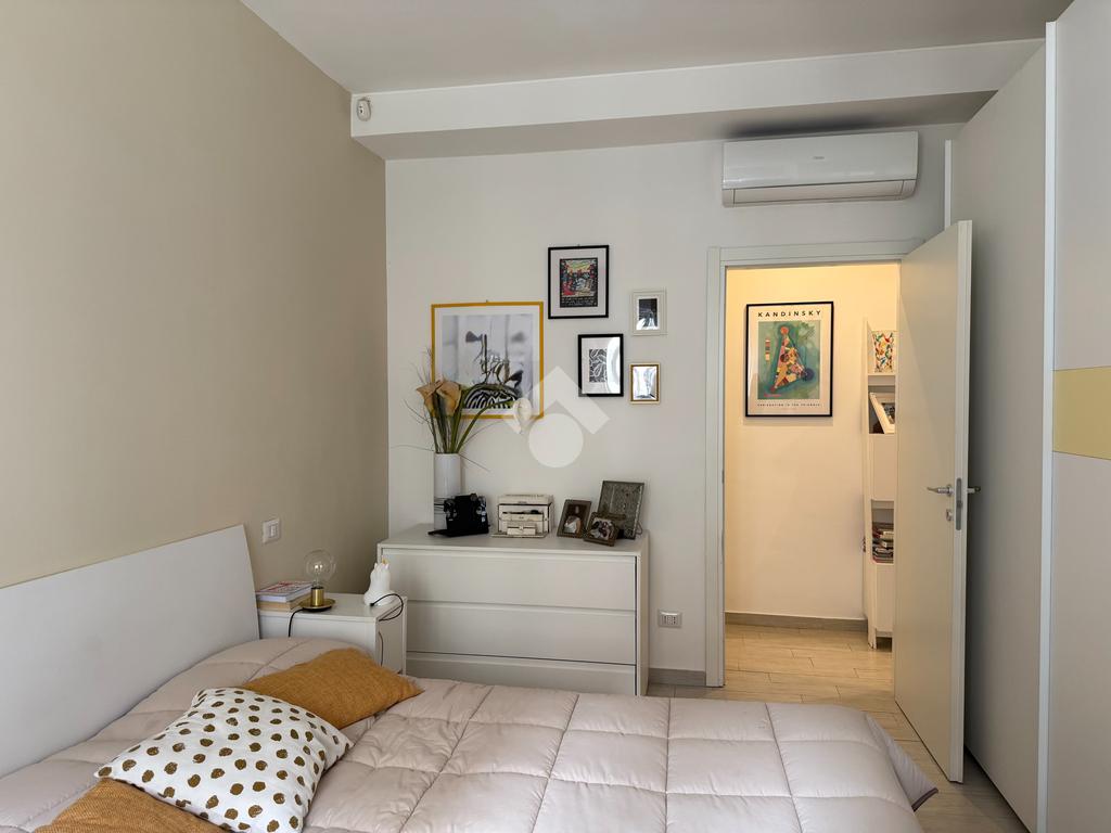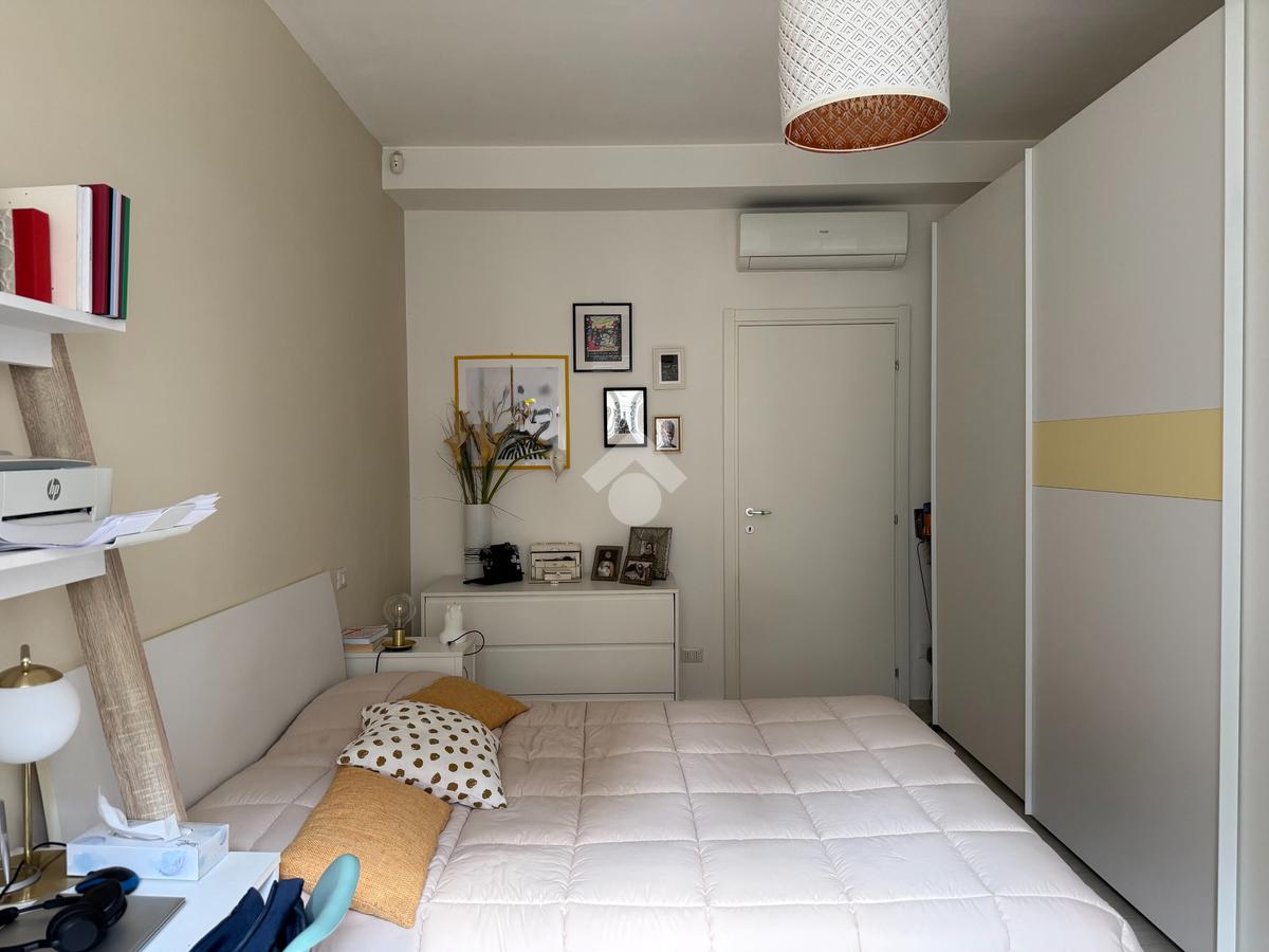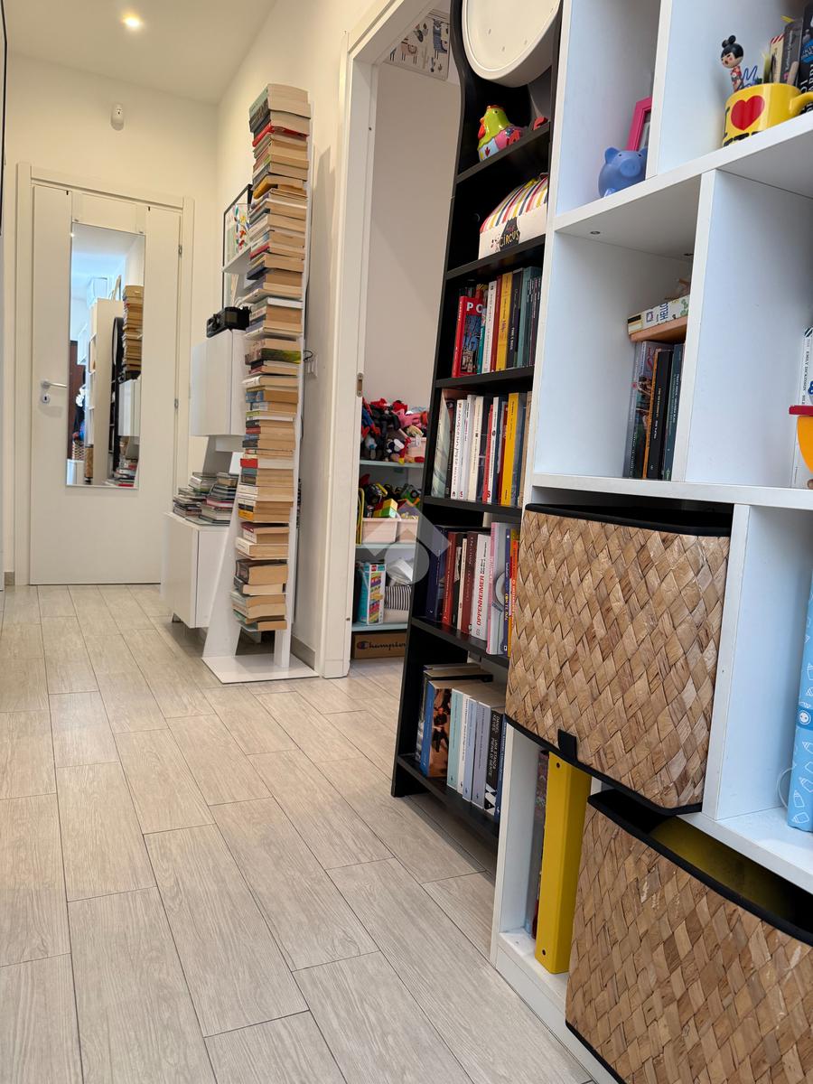 L'appartamento vanta una doppia esposizione, che lo rende particolarmente luminoso e arioso. Entrando troviamo un ampio soggiorno con cucina a vista, perfetto per momenti di convivialità e relax. La zona notte è composta da una camera matrimoniale principale con il proprio bagno privato finestrato e una seconda camera spaziosa, ideale per ospiti o per essere utilizzata come studio. Il secondo bagno, con sistema di areazione, garantisce comfort e funzionalità.