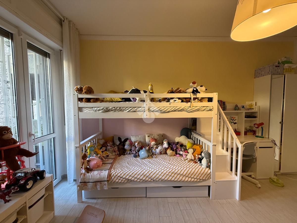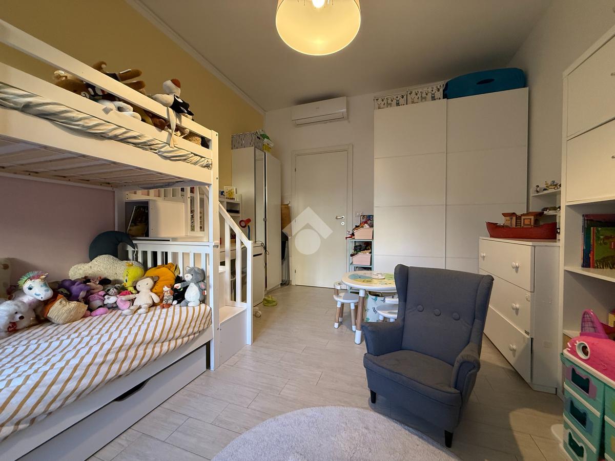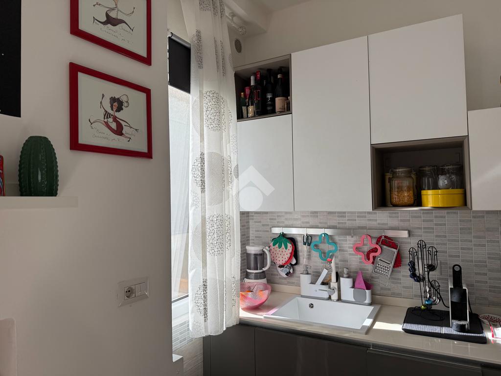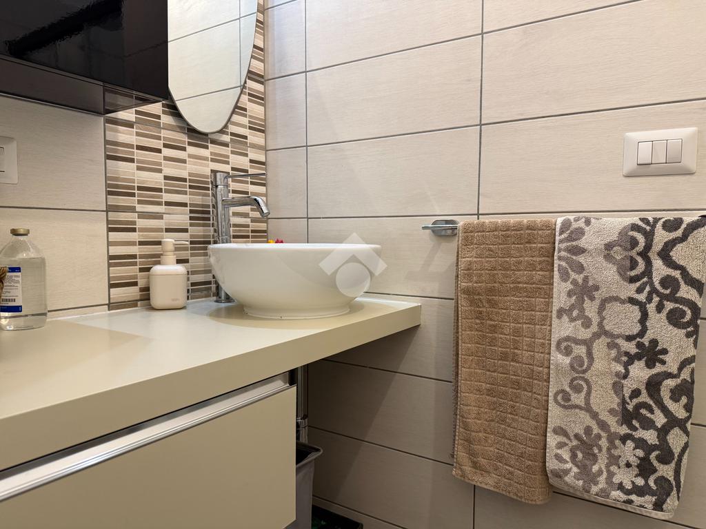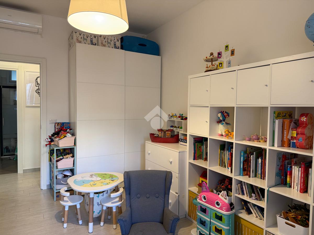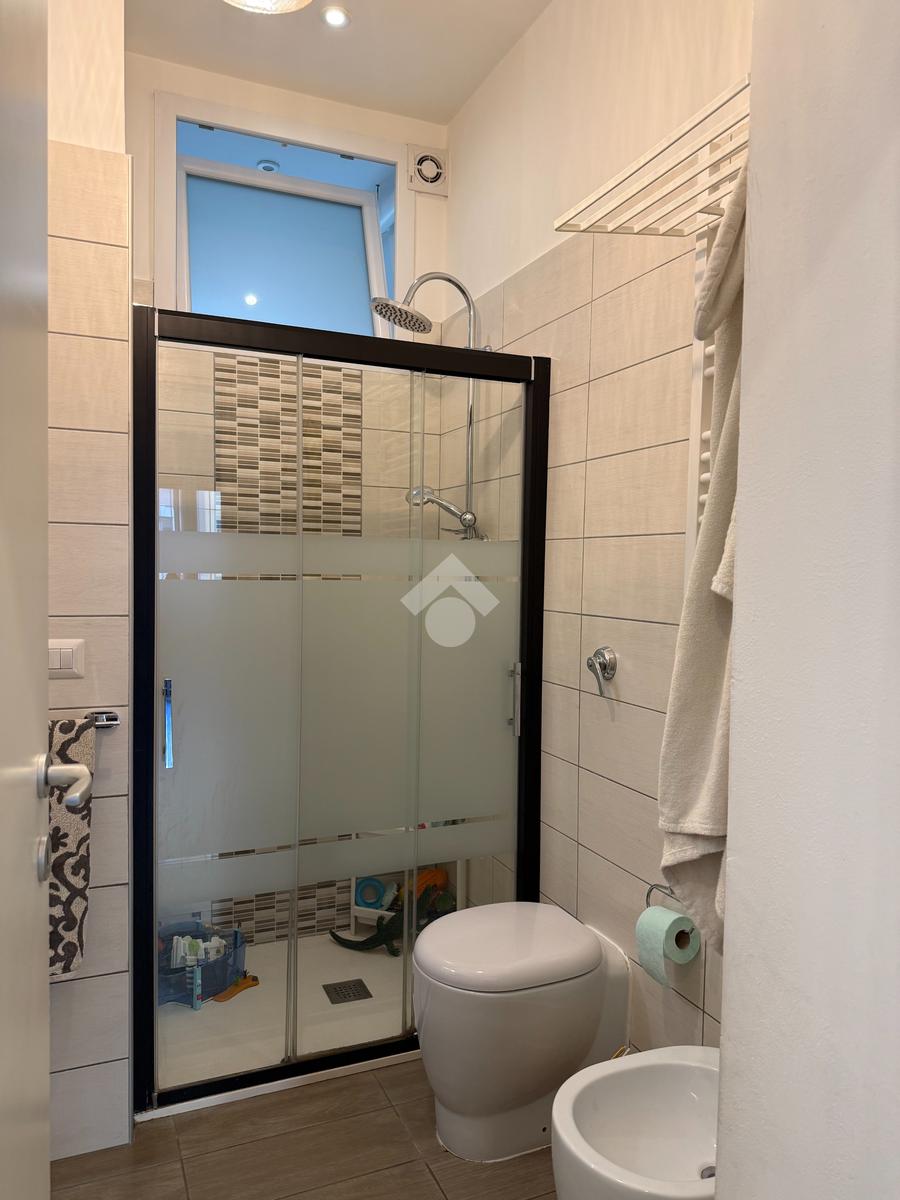 L'appartamento vanta una doppia esposizione, che lo rende particolarmente luminoso e arioso. Entrando troviamo un ampio soggiorno con cucina a vista, perfetto per momenti di convivialità e relax. La zona notte è composta da una camera matrimoniale principale con il proprio bagno privato finestrato e una seconda camera spaziosa, ideale per ospiti o per essere utilizzata come studio. Il secondo bagno, con sistema di areazione, garantisce comfort e funzionalità.